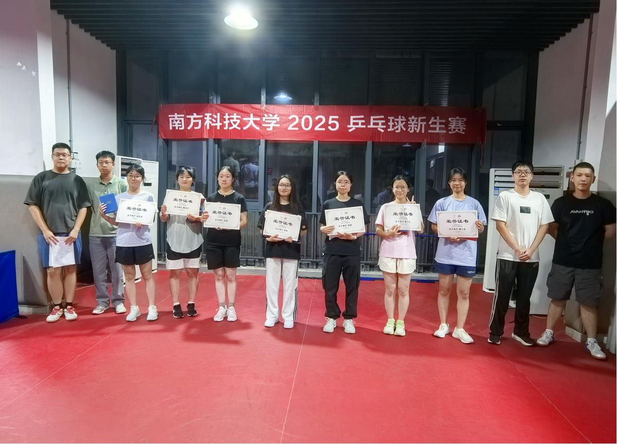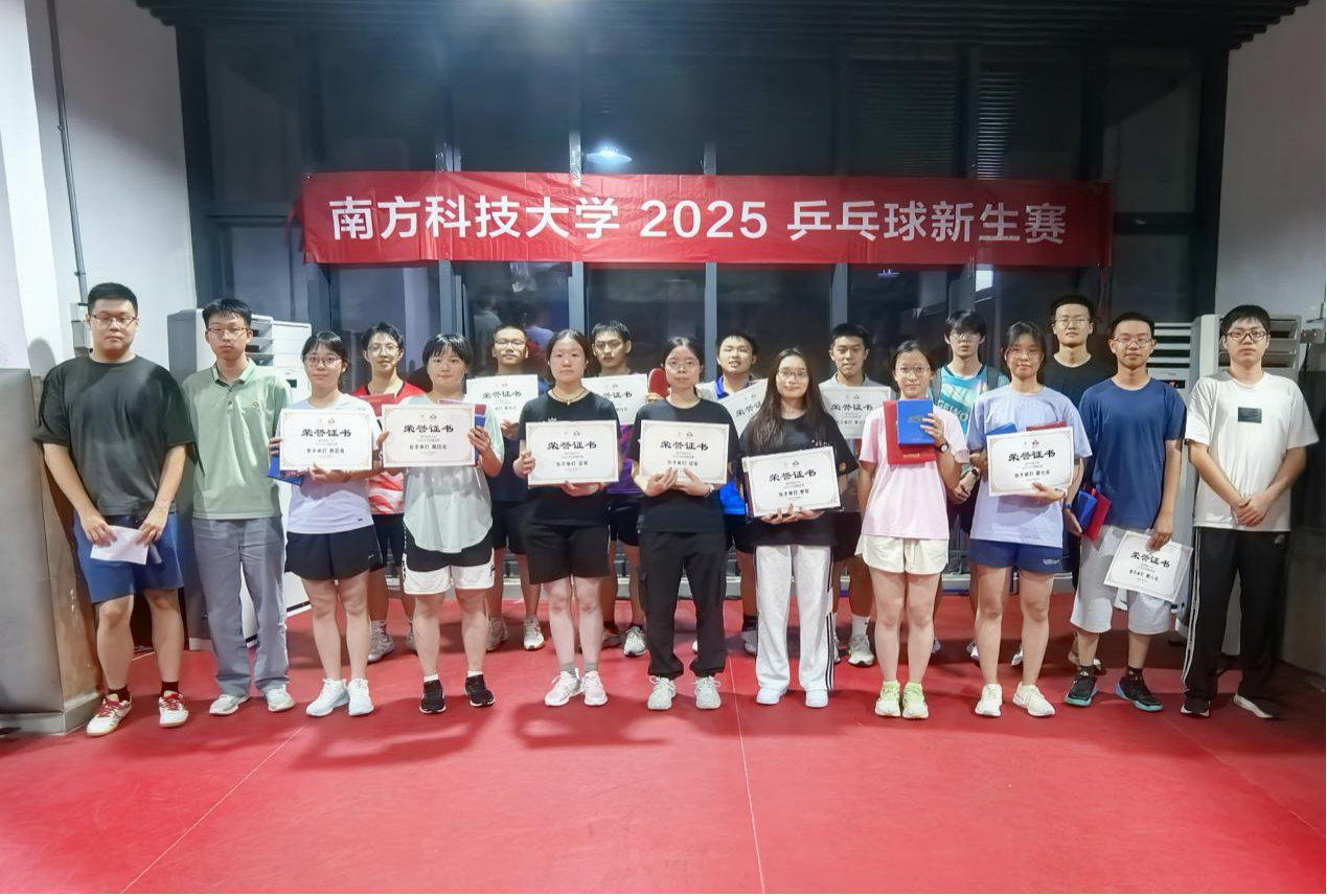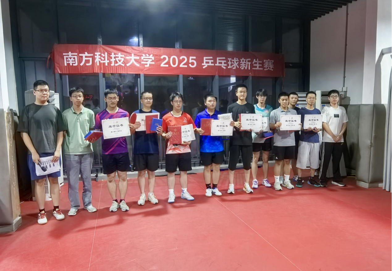 南方科技大学2025乒乓球新生赛于2025年10月12日在南科大乒乓球馆落下帷幕。本次比赛由南科大体育中心主办,南科大乒乓球社承办的全校赛事。比赛分为男子单打、女子单打两个组别,所有参赛选手均为南方科技大学本科、研究生的2025级新生,共吸引了144人参加角逐。最终何梓闻、马麓原、李佳泽获得男子单打前三名,郑易、徐培瑜、陈创妙获得女子单打前三名。
