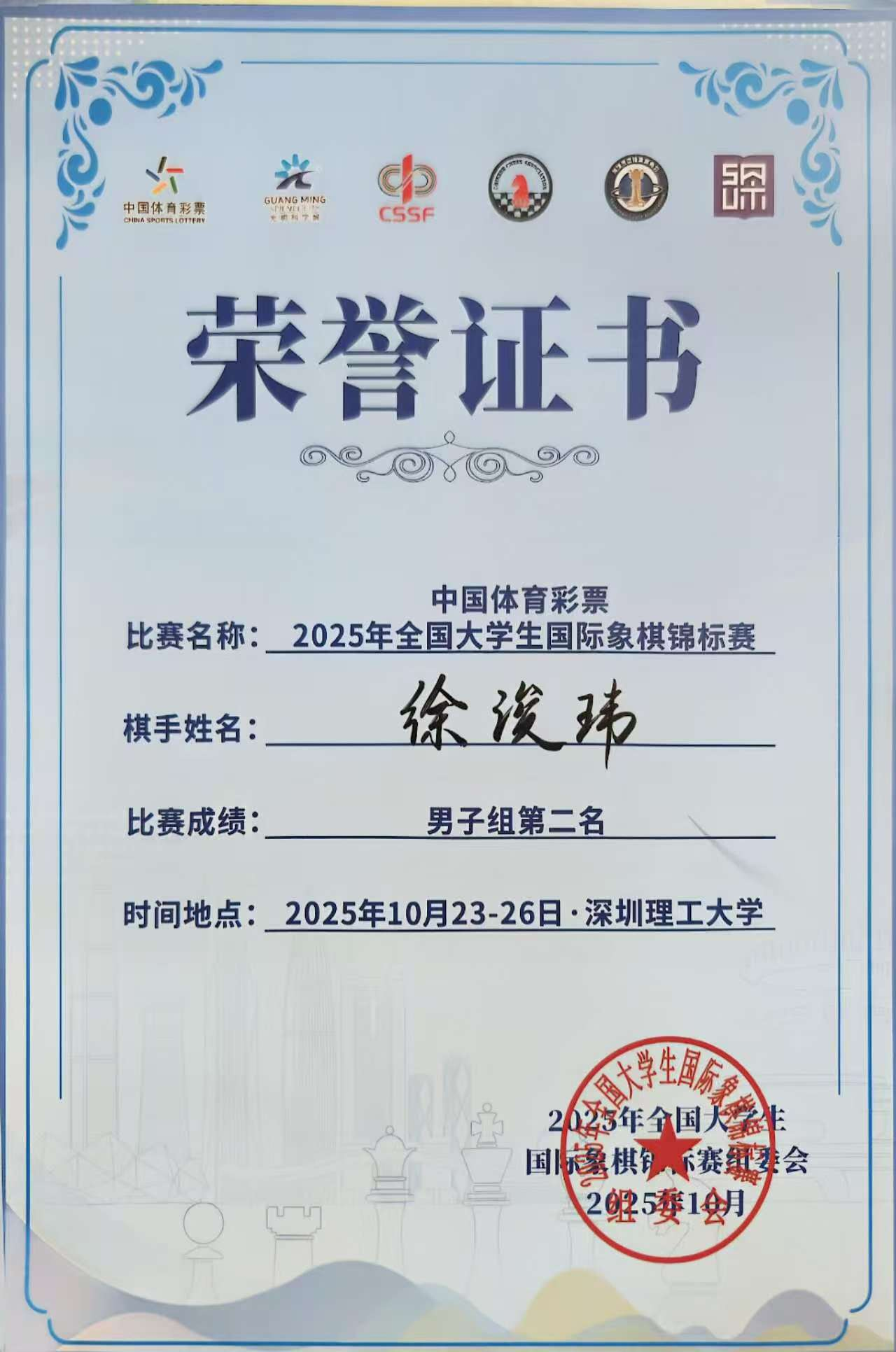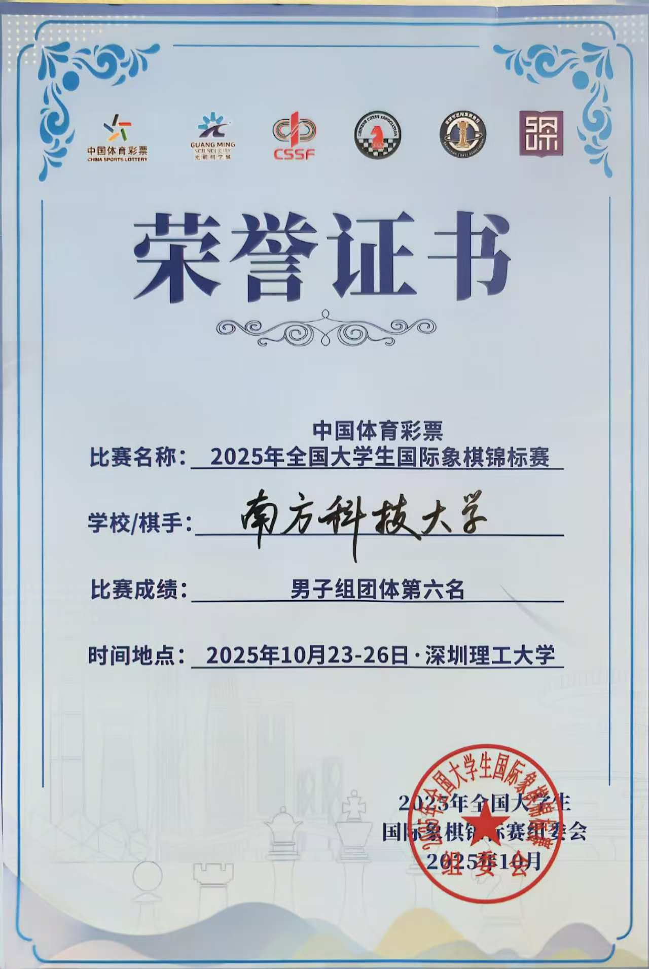 近日,2025 年全国大学生国际象棋锦标赛在深圳理工大学圆满落幕。作为首次代表南方科技大学征战该项全国顶级赛事的队伍,南科大棋牌队不负众望,凭借扎实的功底与顽强的拼搏精神斩获多项荣誉 —— 队员徐浚玮同学勇夺个人赛亚军,男子团体以优异表现跻身全国第六名,另有三名队员成功获评国家三级运动员资格,为学校赢得了亮眼的荣誉。