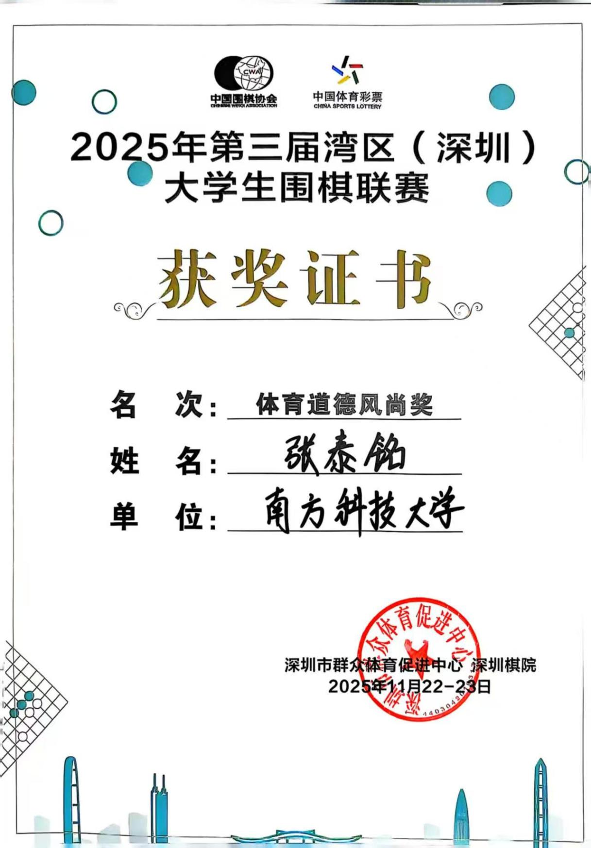 11 月 23 日,为期三天的 2025 年第三届湾区(深圳)大学生国际象棋联赛暨 “特级大师进校园” 活动在深圳棋院(银湖)圆满落幕。我校代表队在体育中心主任董伦红教授的带领下,由侯思宇教练全程指导,凭借稳健的发挥与优良的赛场风貌,斩获团体第八名的佳绩,同时荣膺 “体育道德风尚奖”,在这场国际化智力竞技盛宴中交出亮眼答卷。