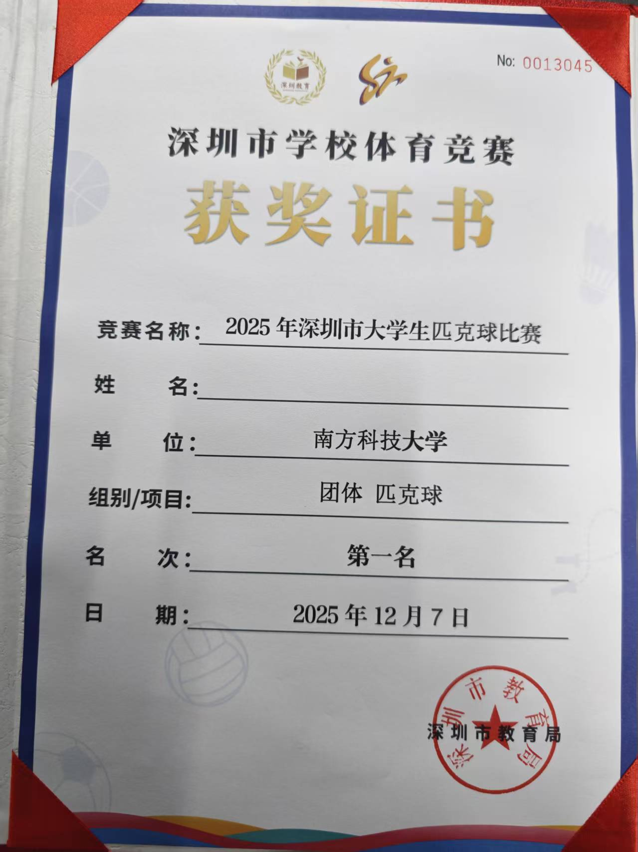 2025年12月7日,2025年深圳市大学生匹克球锦标赛在南方科技大学风雨操场匹克球场圆满落幕。本届赛事由深圳市教育局、深圳市文化广电旅游体育局联合主办,南方科技大学承办。来自南方科技大学、深圳理工大学、哈尔滨工业大学(深圳)、深圳职业技术大学、深圳城市职业学院的队伍同场竞技。