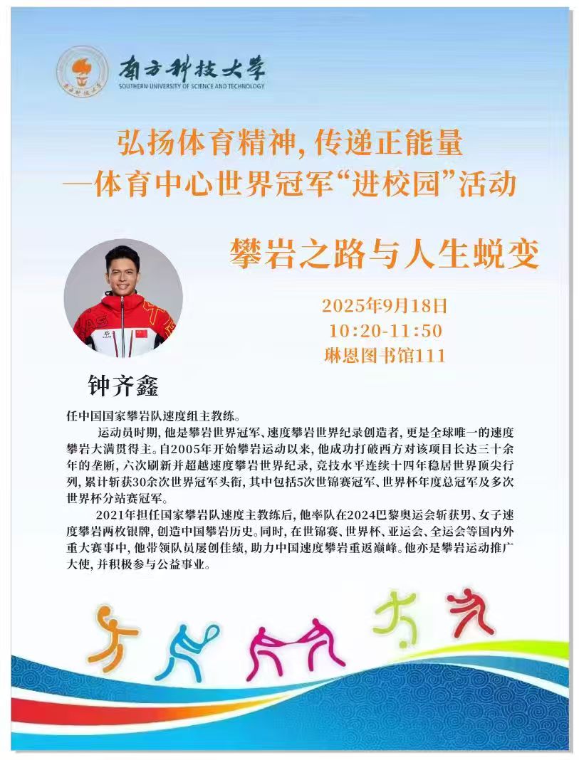2025年世界冠军进校园活动,邀请钟齐鑫,中国国家攀岩队速度组主教练。他率领国家队获得2024年巴黎奥运会男、女子速度攀岩两枚银牌,创造中国攀岩历史。同时在世锦赛、世界杯、亚运会、全运会等国内外重大赛事屡创佳绩。运动员时期,钟教练是攀岩世界冠军、速度攀岩世界记录创造者,更是全球唯一的速度攀岩大满贯得主。他打破西方对该项目长达三十余年的垄断,累计斩获30余次世界冠军头衔。