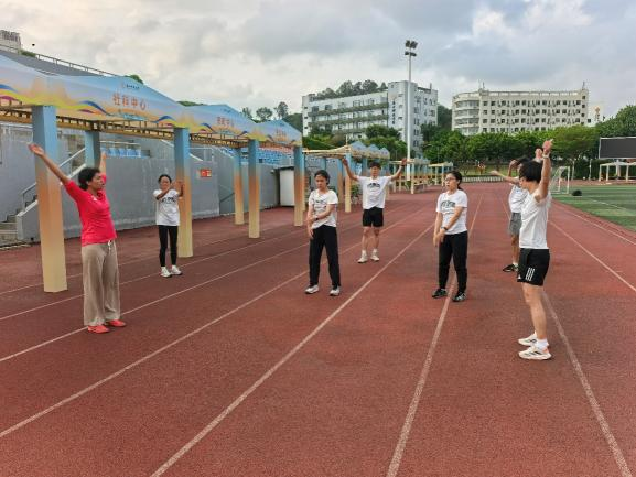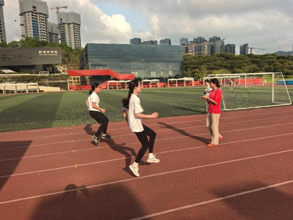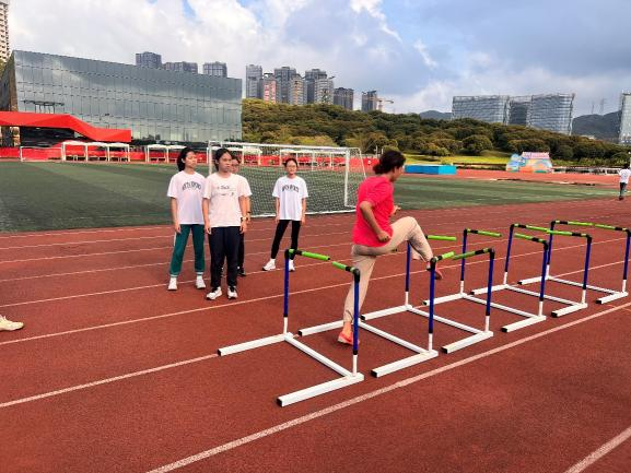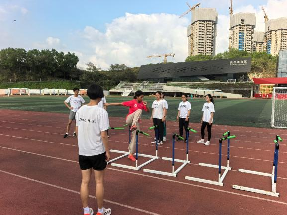 洪老师带着她的“火眼金睛”和丰富的比赛经验指导我们训练。在栏架热身项目中,她亲自上阵示范,教导我们栏架动作应当做充分:手臂应当配合下肢摆动、每一步都要配合呼吸。在讲解跑专动作的要点时,洪老师也仔细指导每一位队员的动作。